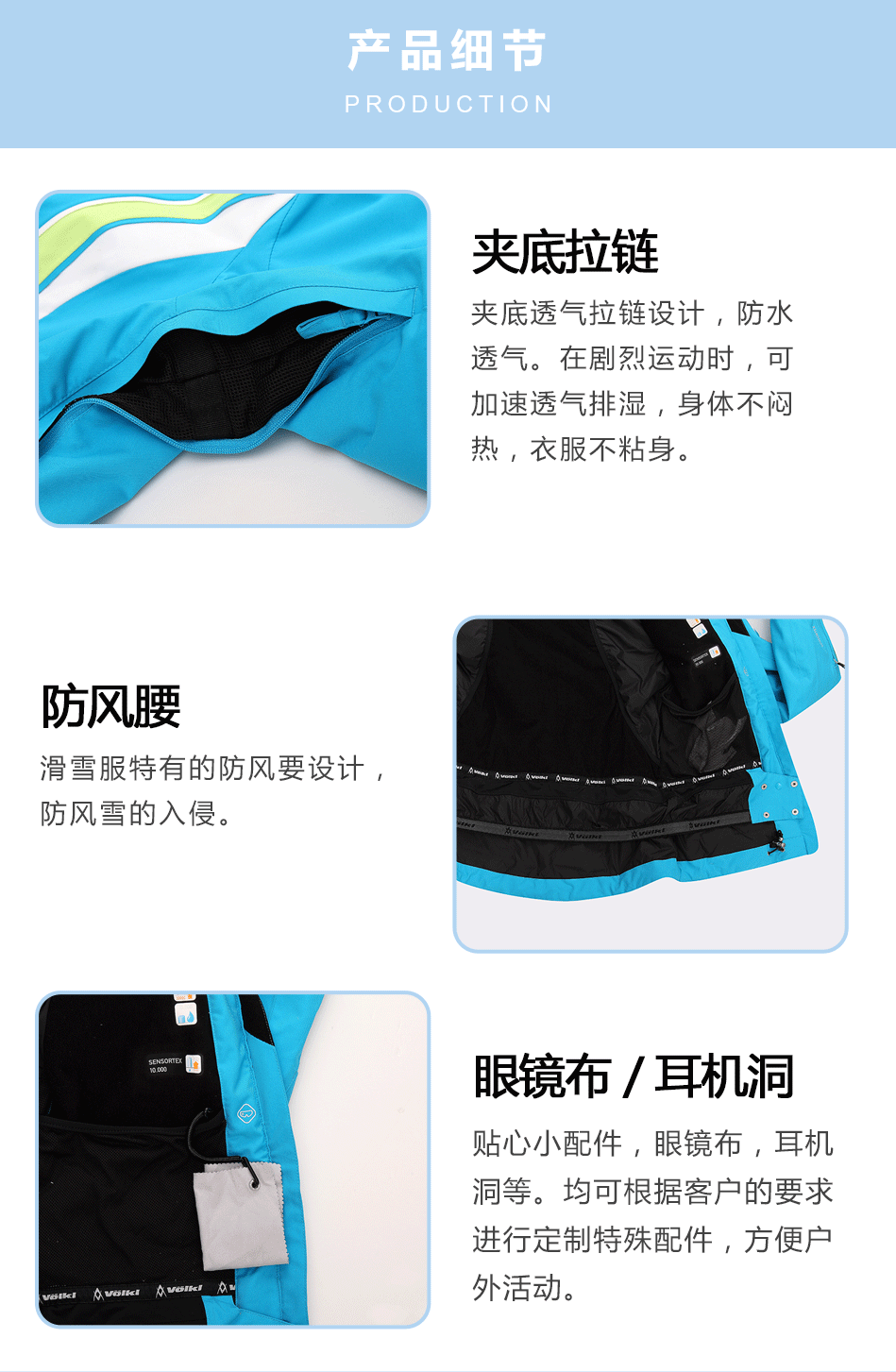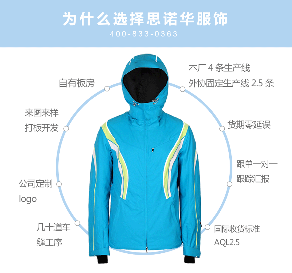 防水拉鏈采用無縫壓膠防水拉鏈激光熱封工藝貼合,面料采用進口防水透氣涂層膜,使防水透氣膜與面料完美結合??筛鶕蛻粜枨?a href="http://www.xixisiwi.com.cn/oem/" target="_self">生產加工沖鋒衣。