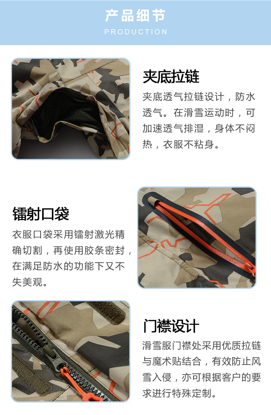 門襟設計:滑雪服門襟處采用優質拉鏈與魔術貼結合,有效防止風雪入侵,亦可根據客戶的要求進行特殊定制。