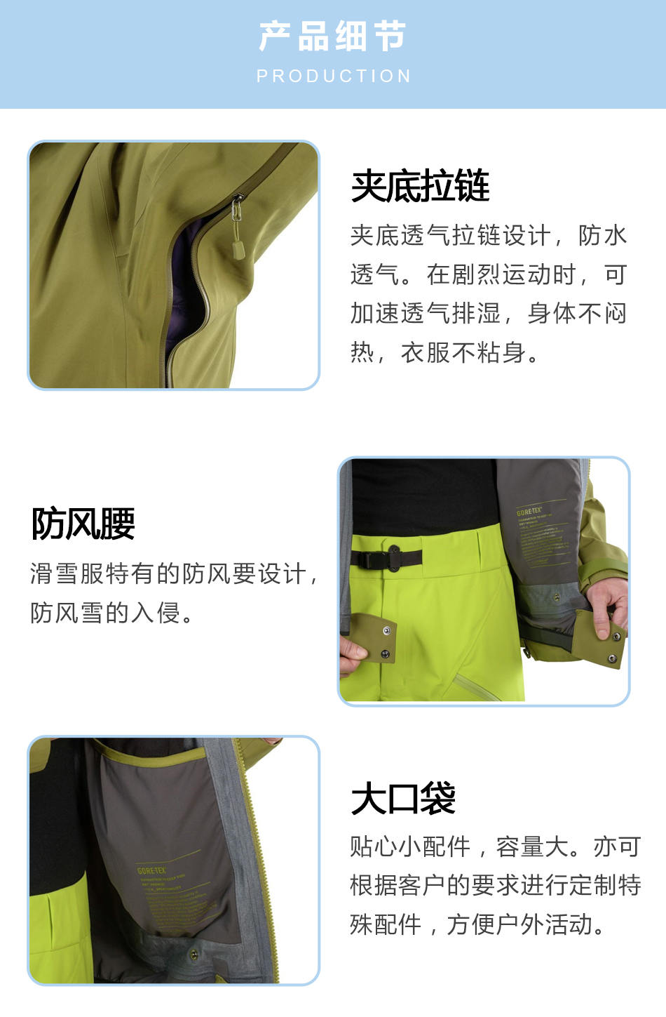 防風腰:滑雪服特有的防風腰設(shè)計,防風雪的入侵。